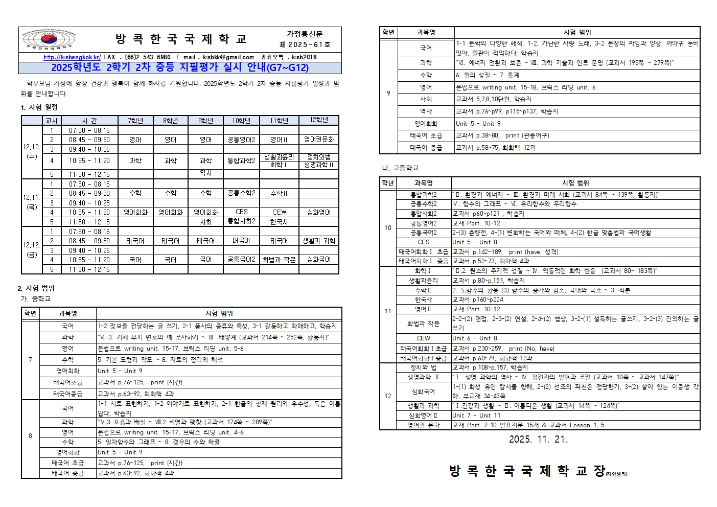 (제2025-61호) 2025학년도 2학기 2차 지필평가 실시 안내